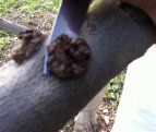 II. metoda: Kod stabla koje ima pojedinačne izrasline (tumore), možemo oštrim nožem izrezati čvorastu izraslinu do zdravog dijela, te središte (tamna točka) izrezanog, dobro očistiti (ekskohleirati) i dobro poprskati ranjenu površinu otopinom streptomicina (1g/dcl), koju naknadno (sutradan) zaštitimo bakrenim preparatom ili voskom (sl.4,5,6) Nismo primijetili povrat izrasline na istom mjestu.